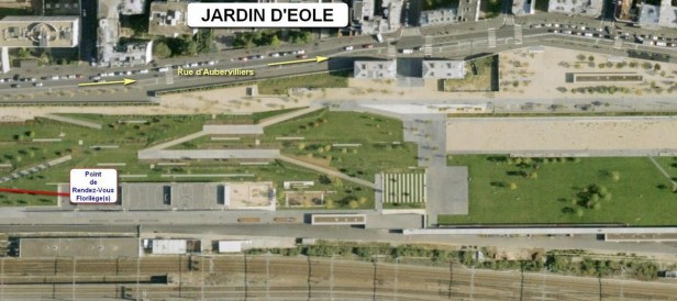 Un camino sombreado estabilizado se extiende la gran plaza escalonada de Aubervilliers avenida Riquet a la calle;