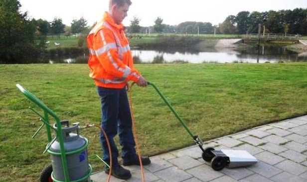 Pistola de fuego: Rocíe las malezas entre losas de pavimentación y en las calzadas de aire mediante una pistola de llama. Úsela sólo cuando el follaje esté seco y permita que se queme suficiente tiempo para que se quemen las malas hierbas con raíces profundas, como los dientes de león.- Taraxacum officinale.