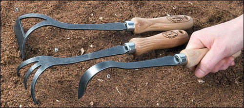 Azadones de tirón son una alternativa más segura porque sus bordes exteriores son lisos en lugar de agudo, reduciendo el peligro para las plantas cercanas. Ambos bordes de la cuchilla de un azadón de horquilla son afilados, así que corta en el empuje y el tirón mientras que lo golpeamos a través del suelo. Muchos jardineros consideran las horcas de los estribos un paso hacia arriba de las azadas del diamante y del triángulo, y cambian a los estribos para las malas hierbas que han formado grupos o crecido más altas.