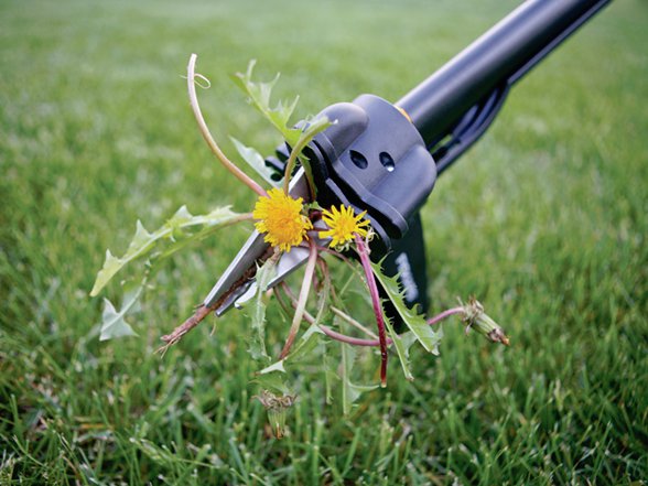 Mi favorito es el Fiskars Stand-Up Weeder , que tiene un conjunto de acero inoxidable serrado garras que salen de la base de la weeder. Simplemente coloque las garras sobre la hierba, pise sobre la almohadilla de pie para presionar las garras en el suelo, y luego doblar el mango de nuevo a pop la maleza. Las garras agarra la mala hierba y una simple diapositiva de la manija eyecta la hierba extraída en su contenedor de recogida. Utilizo esta herramienta todo el tiempo! Funciona a las mil maravillas.