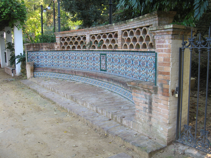 Usó las cerámicas como motivo decorativo de revestimiento arquitectónico, en fuentes, pavimentos y en los abundantes bancos que distribuyo por todo el parque, bancos cubiertos de azulejos que definen la esencia de los jardines sevillanos desde su ubicación en el parque de María Luisa.