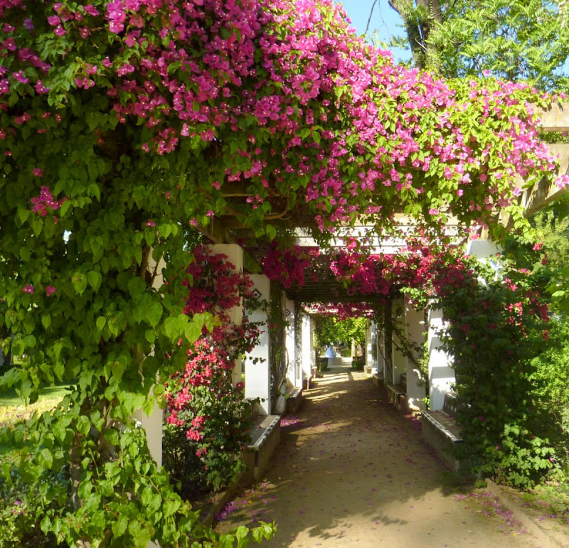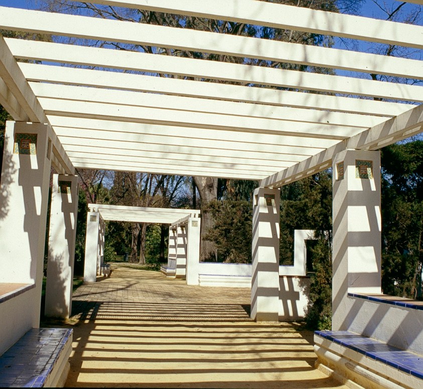 Tanto en el enclave de Los Lotos, como en el de los Leones utiliza las pérgolas, como ornato clásico que el valora en el Parque recubriéndolas de rosales y enredaderas aromáticas y de flor.