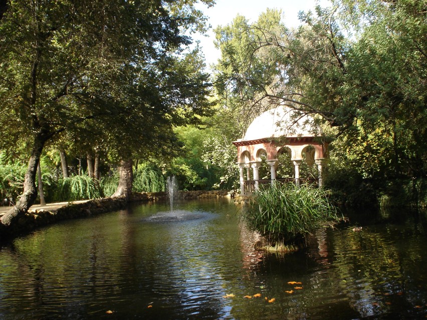Crea un eje longitudinal Norte-Sur bordeado por dos grandes avenidas, situando en cada uno de los extremos de eje dos conjuntos artísticos de clara inspiración islámica, el estanque de los Lotos, replica del Patio del Ciprés de la Sultana en el Generalife de Granada, rectangular, tipo acequia, rodeado de una atractiva pérgola. …. con bancos de ladrillo tallado, que más adelante describimos y la Fuente de los Leones reflejo de su homónima de la Alhambra, octogonal , de ritmo zigzagueante en surtidor, respaldada por una rosaleda.