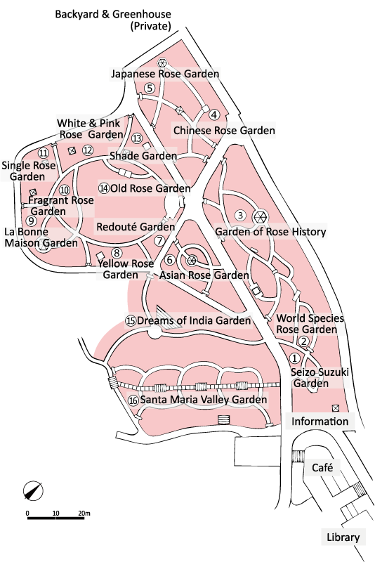 Biblioteca .- La esposa del Sr. Suzuki, la Sra. Haruyo Suzuki, ha donado la biblioteca privada y las herramientas de jardinería favoritas de su marido, tales como sus podadoras, a la ciudad de Sakura, y los miembros del Instituto de Cultura Rose administran estos preciosos regalos accesibles a todos los amantes de la rosa que visitan este jardín de rosas. Por favor venga a la biblioteca junto al café de rosas.
