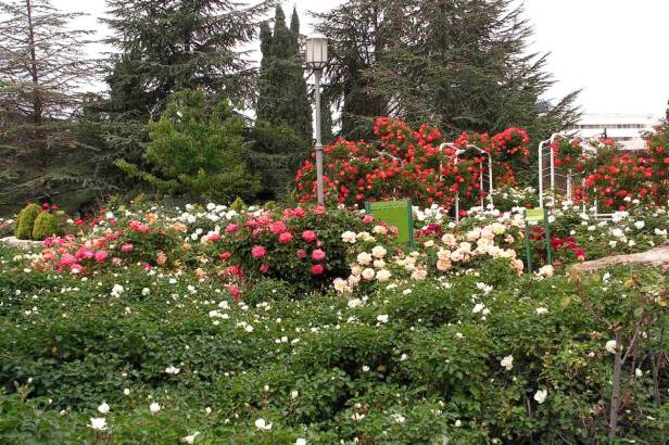 Se reúnen en el jardín diferentes tipos de rosas, como las especies originales, el patrimonio y las rosas modernas, cada una cultivada en un área especial. En la sección de exposición de las rosas del patrimonio, las especies originales, variedades y cultivares antiguos se exhiben siguiendo el curso evolutivo.