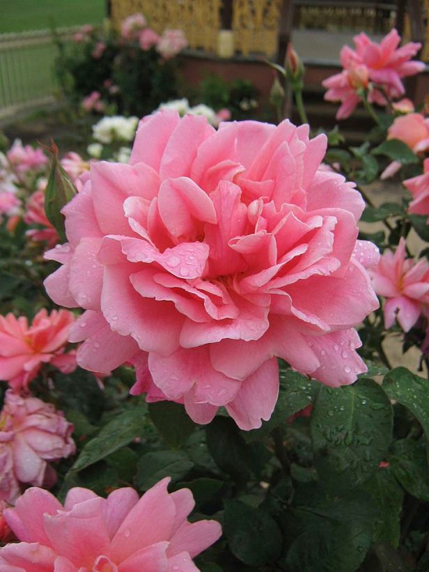 Rosas arbustivas incluyendo – tipos de té híbrido con sus flores grandes, muchos de los cuales son fragantes. Rosas floribundas con sus racimos de flores individuales de una amplia gama de colores. Pocos son fragantes, pero producen más color en toda la planta.