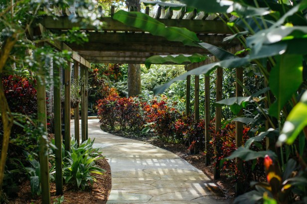 Una cuidadosa combinación de una selección de árboles, arbustos, hierbas y orquídeas (en su mayoría híbridos) con follaje y colores a juego floral representa la combinación de colores.