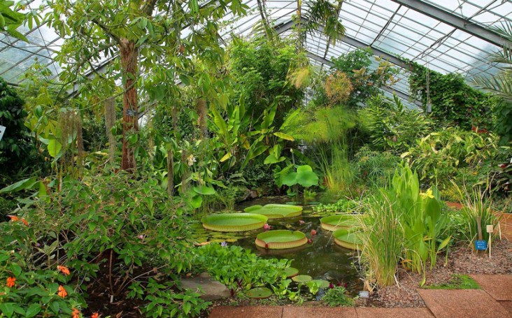 Colecciones de coníferas, Árboles y arbustos caducifolios, Invernaderos tropicales y templados, Jardín de plantas acuáticas, Jardín de hierbas