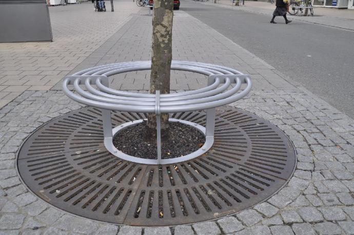 En espacios renovados con árboles existentes conservados, Se recomiendan las protecciones hechas en terrazas de madera porque permiten adaptar mejor los muebles a las circunferencias y a las plantaciones muy variables de los árboles (posibilidad de a un costo más bajo rejillas personalizadas para cada tema).