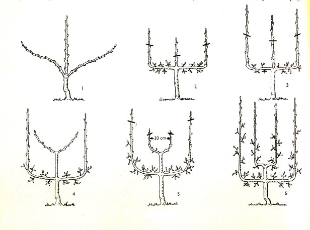 Cualesquiera otros brotes se frotan distancia. Extracción del eje vertical completa la espaldera en forma de V.