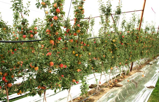 Más tarde, se puede disminuir el crecimiento al tiempo que aumenta la producción de fruta mediante la capacitación en forma horizontal,