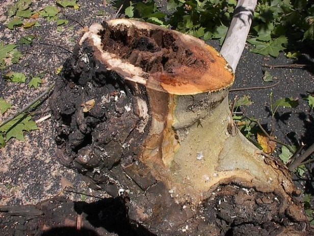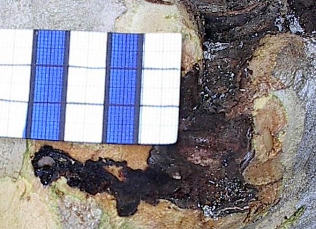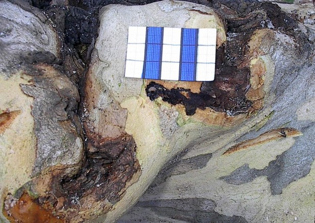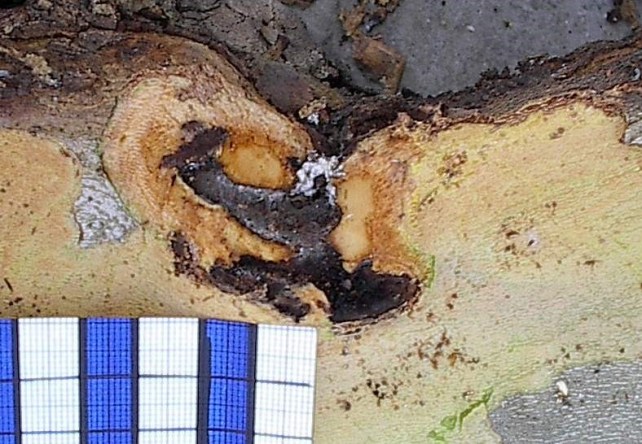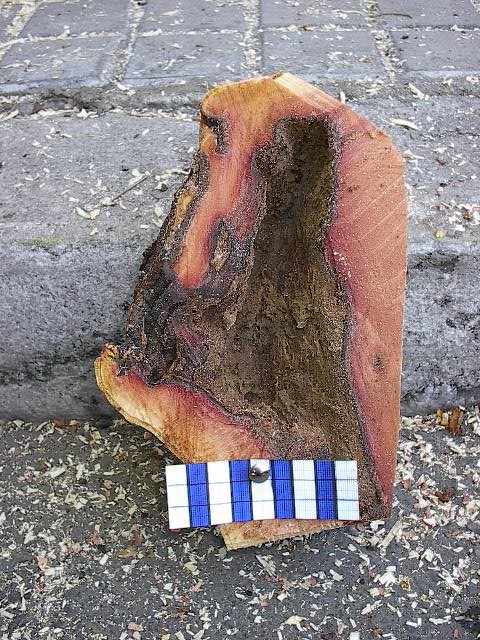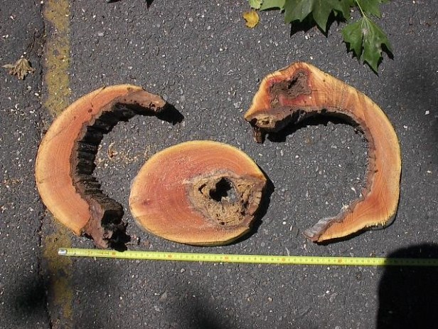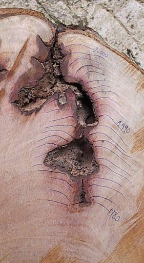Las secciones transversales realizadas en troncos adultos muestran claramente que estas cavidades no tienen un origen reciente (algún tipo de agente que en estos últimos años esté socavando madera anteriormente en buen estado) sino que se observa cómo las lesiones tienen un origen antiguo, y acompañan al árbol en su desarrollo (como se demuestra por el hecho de que los anillos de crecimiento interiores se curvan hacia los daños).