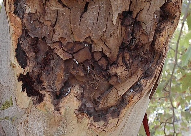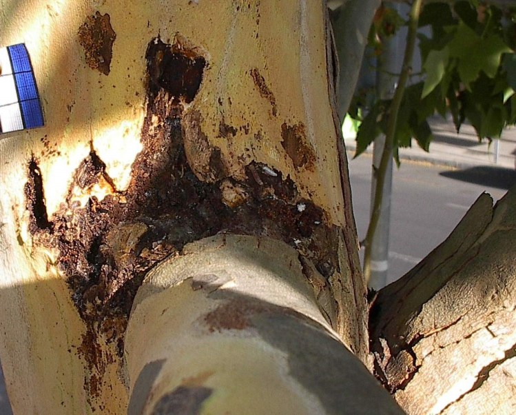 En arbolado adulto, aún cuando, como se verá más adelante, coexisten varios tipos de daños (y de agentes), las lesiones que más llaman la atención consisten grandes daños y deformaciones en los troncos y ramas principales, algunas con aspecto chancroide, cavidades importantes, y deformaciones del tronco plagadas de pequeñas heridas abultadas que, frecuentemente, presentan los bordes oscurecidos y llegan a exudar un flujo negruzco.