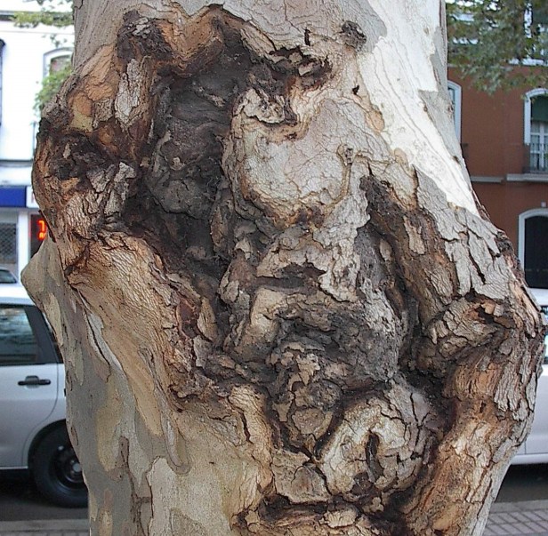 Los árboles jóvenes (de 20 ó 25 cms. de diámetro), tanto ejemplares de reposición en las alineaciones adultas, como en nuevas plantaciones, muestran un tipo de lesiones completamente diferente, principalmente en las horquillas de las ramas laterales, pero también en la base del tronco y, en menor medida, en cualquier punto del tronco