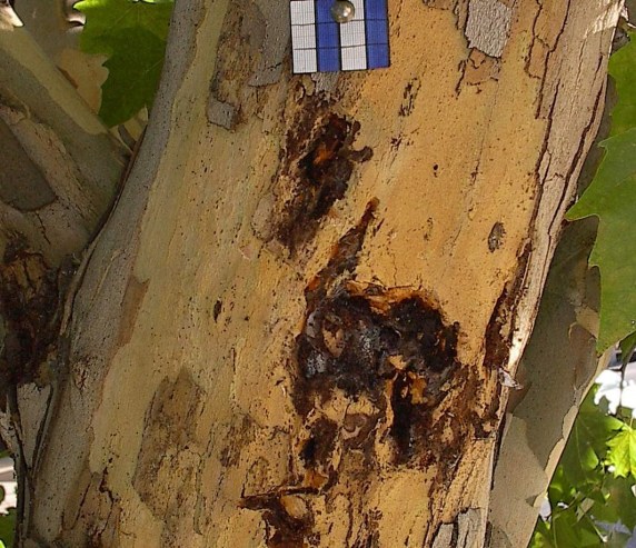 El plátano está representado en Sevilla (y en el resto de España) por la especie Platanus x hispanica. Esta especie es muy abundante en la mayor parte de las ciudades europeas, siendo considerada como vigorosa, y muy resistente a heridas y podas, con buena compartimentación, buen cierre de heridas, brotaciones epicórmicas fuertes y con buen anclaje, etc. Sin embargo, hemos comprobado en este trabajo que, al menos en Andalucía y en la costa mediterránea, no muestra su proverbial resistencia, sino que desarrolla daños, pudriciones y cavidades graves, desconocidas en otras latitudes.