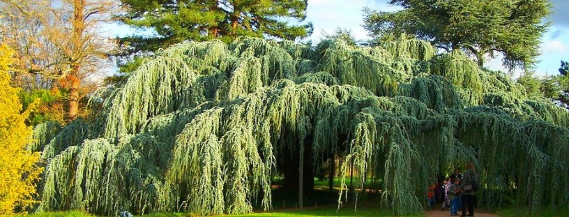En este lugar, un viverista plantó un Cedro azul del Atlas (Cedrus atlantica Glauca), pero apareció una mutación que le daba un aire llorón a este árbol.