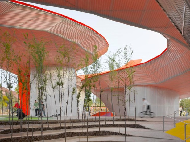 Este nuevo campo de juego se encuentra en un césped existente y conformada como una manta de color rojo doblado con un fuerte carácter gráfico.