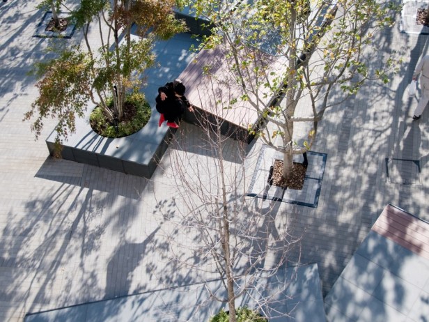 Zonas para sentarse y árboles nuevos se concentran en las islas, que dejan vacíos grandes áreas de espacio y también sirven como centros de coordinación en este vacío.