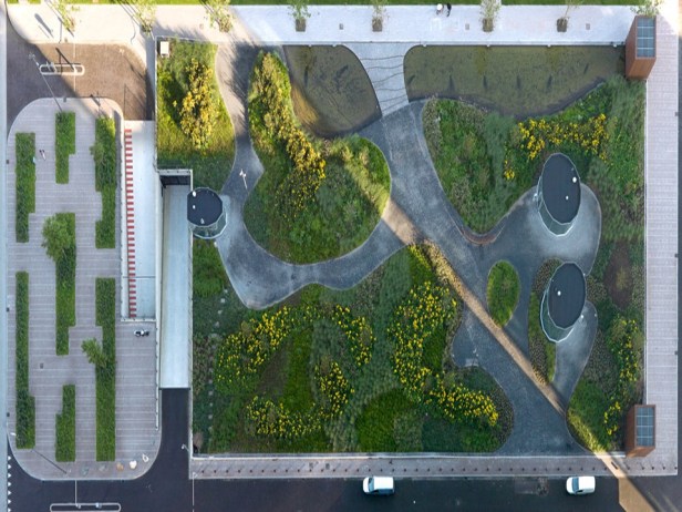 El parque está situado en el techo de dos capas de cuatro aparcamientos subterráneos.