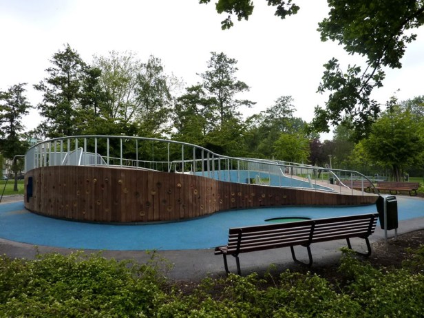 Todas las áreas de playa y aparcamientos están vinculados a las vías y estructuras arbóreas. Los nuevos elementos de la playa están diseñados especialmente para este lugar, mantener los objetos en el suelo o desde lo más transparente posible. Una estructura de madera ascendente es una frontera cajón de arena y el elemento sentado, desarrollándose en una pista de madera con una diapositiva. La superficie de seguridad tectónica contiene un disco giratorio gigante incorporado. La más de ocho metros de alto de la torre de escalada (apodado ‘chimenea’) ha pilares y un volumen en el nivel del dosel de los árboles de los alrededores como Treetrunk. Permite que los niños experimenten el parque desde una altura enorme.