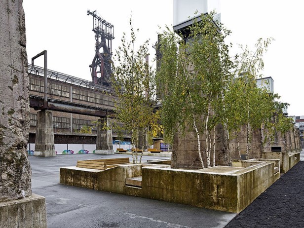 Entre que miran hacia adelante edificios de gran altura y los altos hornos del pasado, la nueva plaza Romana es el centro de Belval Ouest, un proyecto de desarrollo de la ciudad que se construye actualmente en Luxemburgo, en los terrenos de una antigua fábrica de acero.