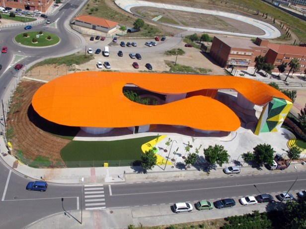 Este nuevo campo de juego se encuentra en un césped existente y conformada como una manta de color rojo doblado con un fuerte carácter gráfico.