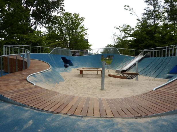 Todas las áreas de playa y aparcamientos están vinculados a las vías y estructuras arbóreas. Los nuevos elementos de la playa están diseñados especialmente para este lugar, mantener los objetos en el suelo o desde lo más transparente posible. Una estructura de madera ascendente es una frontera cajón de arena y el elemento sentado, desarrollándose en una pista de madera con una diapositiva. La superficie de seguridad tectónica contiene un disco giratorio gigante incorporado. La más de ocho metros de alto de la torre de escalada (apodado ‘chimenea’) ha pilares y un volumen en el nivel del dosel de los árboles de los alrededores como Treetrunk. Permite que los niños experimenten el parque desde una altura enorme.