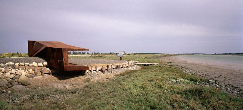 Por esa razón, los lugares elegidos para parar y contemplar el paisaje han sido diseñados con un poco de «reverberación povera», como los restos dejados por el mar en su retirada, se convirtió en una acumulación de piezas de metal oxidado o madera, una gran cantidad de chatarra que, semienterrados, da la bienvenida a los nuevos senderistas, dentro o encima de ellos.