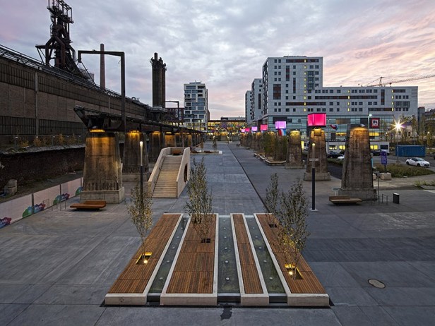 Entre que miran hacia adelante edificios de gran altura y los altos hornos del pasado, la nueva plaza Romana es el centro de Belval Ouest, un proyecto de desarrollo de la ciudad que se construye actualmente en Luxemburgo, en los terrenos de una antigua fábrica de acero.