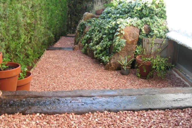 6.- Cubriremos la malla antihierbas con una capa de 6-8cm de grava, canto rodado o piedras decorativas si utilizamos acolchados minerales o acolchados orgánicos preferiblemente.