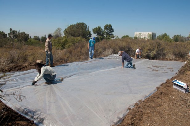 2.- Cubriremos la superficie con la malla antihierbas fijándola firmemente a la tierra con grapas de alambre consistentes.