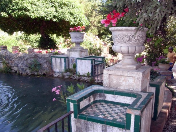 El recorrido del agua comienza en la Esfinge, elemento más definitorio del jardín (Escultura de Enrique Martín Higuero con cuerpo de león, cabeza femenina y alas de mariposa con detalles Decó de gran interés), y va descendiendo por los distintos estanques y fuentes.