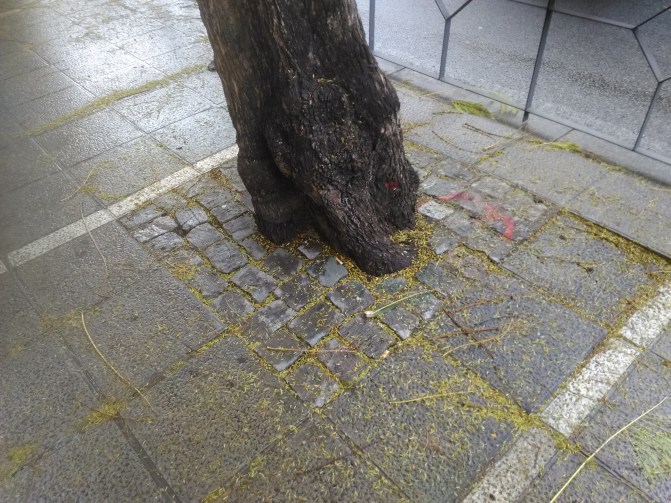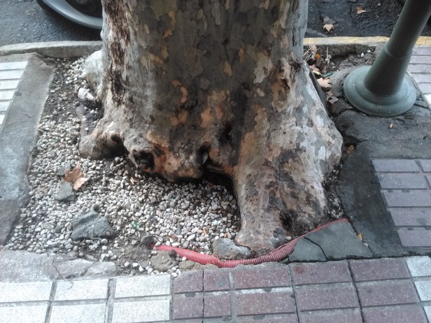 Practica extendida en la ciudad de cubrir alcorques con adoquine,.Estrangulación de los arboles