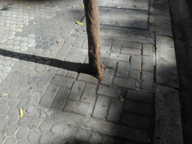 Destrucción de pavimento el perímetro de un alcorque, por causa del crecimiento de la especie vegetal.