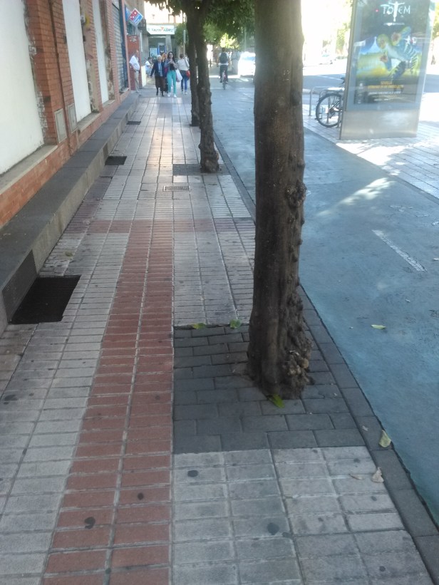 Alcorque sobre elevado, puede ser un elemento de tropiezo. Alcorque sin enrasar con el pavimento circundante y careciendo de cubrealcorque.