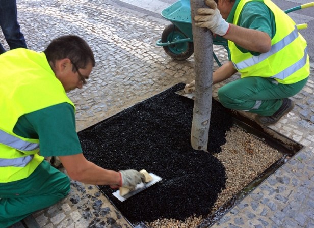 Las soluciones que he encontrado se basan fundamentalmente en el recubrimiento del alcorque con una capa de caucho drenante, pero en la práctica este material termina vulcanizando debido a las altas temperaturas, perdiendo de este modo su capacidad drenante y pudiendo provocar asfixias radiculares.