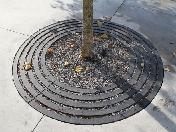 Los alcorques cubiertos con neumáticos reciclados y pintados están resultando muy nocivos para los árboles urbanos. Al menos en mi geografía. Parece que impiden la respiración y el paso de agua. Los árboles amarillean y mueren.