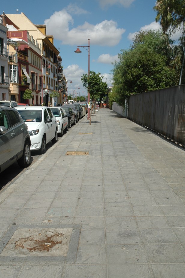 Los cubre alcorques de rejilla que no están correctamente enrasados, con peligro de caídas, ojo los tacones de las señoras.