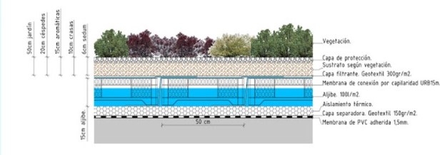 Una carga en una cubierta intensiva puede alcanzar entre 700 y 1.200 kg.m2 lo que exige un mayor dimensionamiento de la estructura.