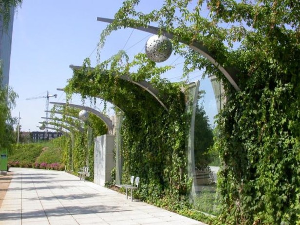 Este muro tiene la doble función de proteger acústicamente para asegurar la tranquilidad del paseante en el parque y servir de soporte a la vegetación de la cara interior del parque formada por parthenocissus quinquefolia y hedera helix.