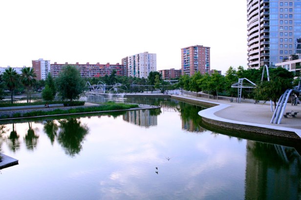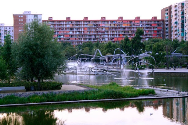 ¿Por qué nos gusta tanto? Porque se trata de una superficie de 14,31 hectáreas transformada en el primer parque barcelonés concebido bajo criterios de desarrollo sostenible. Su sistema de riego es autosuficiente y aprovecha el agua freática para el riego del césped, para el agua de los estanques y de las fuentes. También nos gusta por causa de la sensación de amplitud que provoca; por su zona lúdica repleta de equipamientos de madera; por sus juegos, que hacen a la vez de instrumentos musicales; por sus altos, anchos y ultramodernos toboganes que, aunque no resbalen del todo, no nos dejan indiferentes (entran ganas de buscar urgentemente un pareo que agilice la bajada); por las montañas de césped realmente verde que emergen de la nada invitándote a una buena escalada; por sus sinuosos bancos concebidos para el reposo (o más bien para el juego, en el caso de Teo)… Y no nos podemos olvidar de su impresionante estética vanguardista.