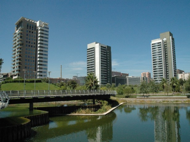El conjunto presenta un logrado contraste visual, con las islas (illas) de edificios que rodean el parque Diagonal Mar y que forman el nuevo barrio con el mismo nombre.