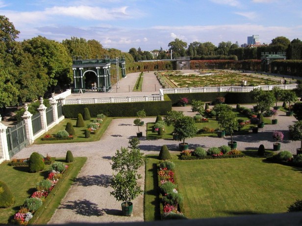 El jardín tenía un paisaje rodeado por cortado de cobertura, así como el Belvedere fue la construcción, en el formal francés manera con paseos de grava y jeux d’eau por Dominique Girard, que se había entrenado en los jardines de Versalles como un alumno de André Le Nôtre. Su gran estanque de agua en la parte superior del parterre y las escaleras y cascadas habitadas por ninfas y diosas que unen parterres superiores e inferiores sobreviven, pero los parterres de planta de temporada estampadas mucho tiempo en el césped están siendo restaurados.