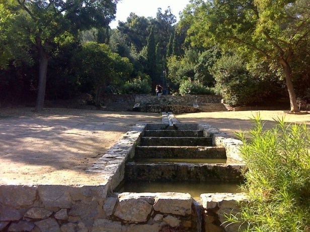 Las escaleras del Generalife. -El agua es la esencia del jardín, con pequeños y grandes estanques. Para conectar la parte superior del parque con los Jardines Amargós, actualmente Jardines del Teatre Grec, Forestier diseñó una escalera inspirada en la de los jardines del Generalife, con cascadas en los pasamanos, estanques con fuentes en los rellanos y bancos de piedra para reponerse y disfrutar del frescor y el sonido del agua.