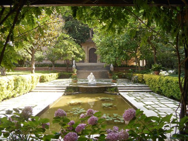 El jardín responde a un trazado de evocación hispano musulmana: vemos toques cerámicos, los amparados sobre columnatas, los arriates, las escalinatas y pavimentos de barro cocido, la cuidada combinación de especies botánicas como palmeras, laureles, cedros, mirtos. Y, por supuesto, el agua.