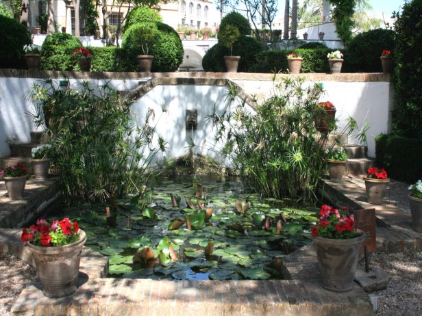 Pasando por otra escalera, son múltiples en este lugar, llegamos a una fuente circular que alberga una masa arbustiva de calas (Zantedeschia aethiopica).