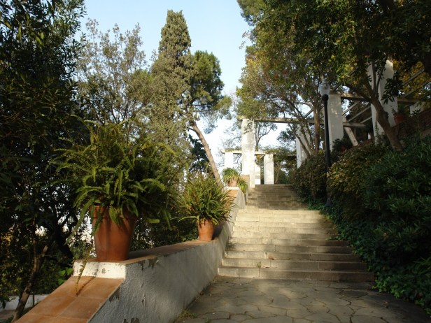 Todo está cubierto por un espeso follaje mediterráneo y árboles frutales, como nísperos e higueras y palmeras de enormes copas. lo miramos desde abajo, junto al paseo de Santa Madrona, vemos que los altísimos cipreses situados al inicio de la cascada acentúan la verticalidad del conjunto.