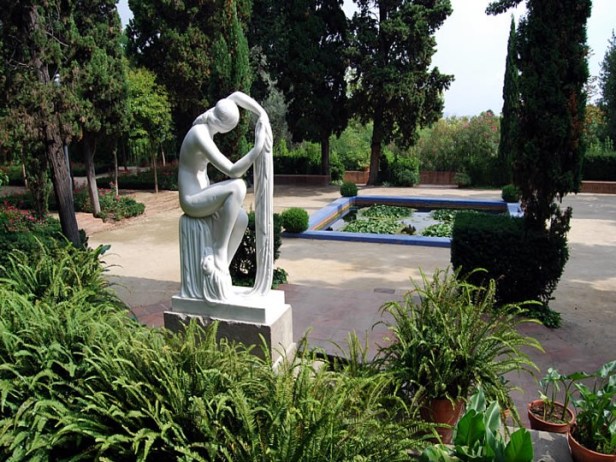 El jardín responde a un trazado de evocación hispano musulmana: vemos toques cerámicos, los amparados sobre columnatas, los arriates, las escalinatas y pavimentos de barro cocido, la cuidada combinación de especies botánicas como palmeras, laureles, cedros, mirtos. Y, por supuesto, el agua.