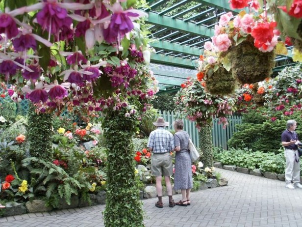 Butchart Gardens.Jardin de las begonias Fuchsias y begonias bulbosas en basquets