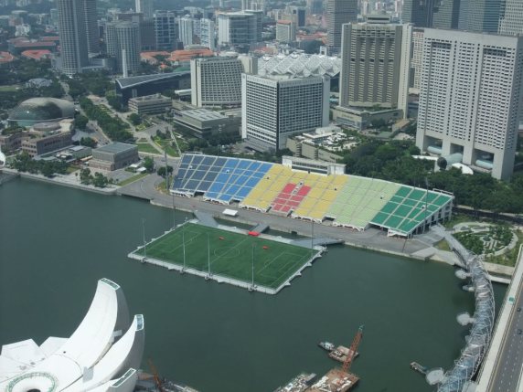 The Float.-Pista polideportiva flotando Marina-Bay-Sands-Skypark-Singapore.-Piscina al infinito en altura